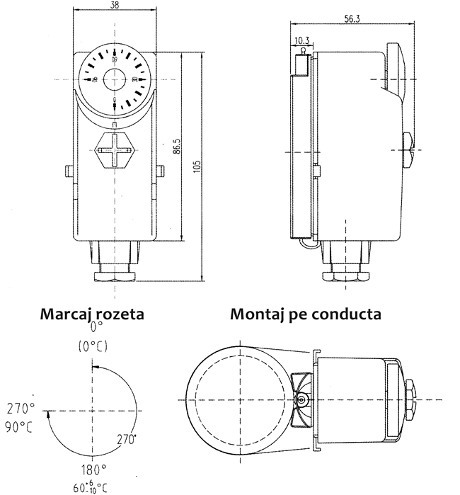Termostatul are plasat frontal o rozeta de reglaj cu grila marcata in °C, pentru reglarea temperaturii in domeniu 0 … +90°C.